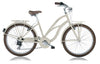 beachcruiser-model, alu kader, 7 versn. Shimano Tourney Revoshift, cassettetrapas, voor- en achterdrager, alu V-brakes en remgrepen, alu naven, alu dubbelwandige velgen, metalen kettingkast en spatborden, bruine 26 x 2.125 buitenbanden, alu stuurpen, verlichting, Selle Bassano zadel.